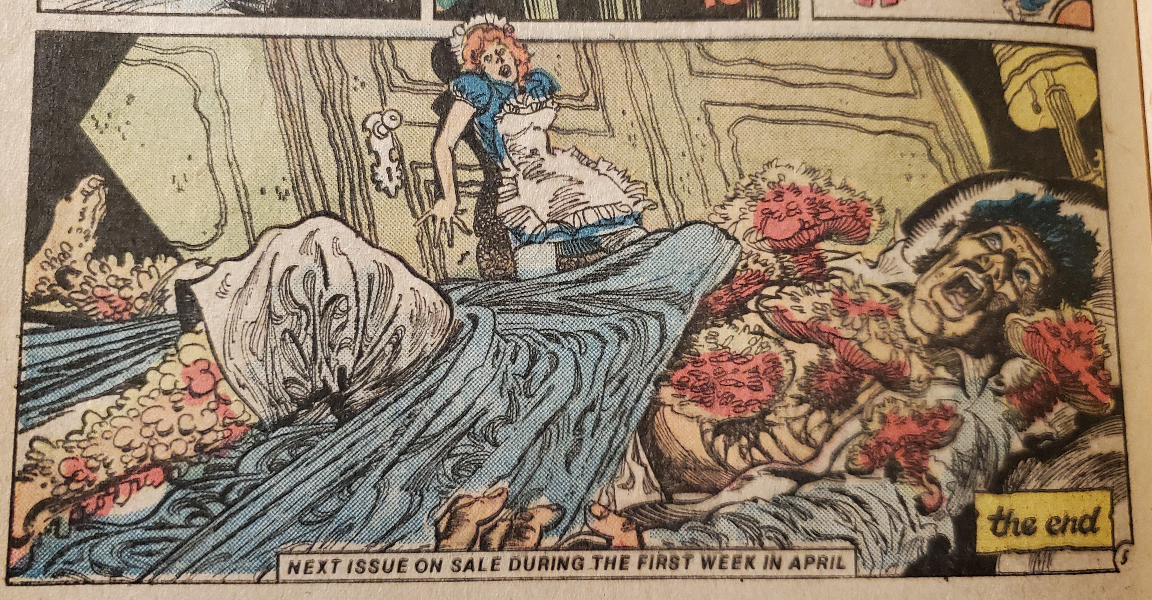 The rest of the issue is pretty standard fare for mainstream horror comics at the time; filled with jokey interludes and well-earned comeuppances and featuring art by Nestor Redondo among others. (Art chores in “The Mushroom Man” are handled by Buddy Gernale.) There’s a jab at dentists that I’m sure dentists don’t appreciate and a story of adoption horror that makes Jaume Collet-Serra’s Orphan seem positively buoyant by comparison.