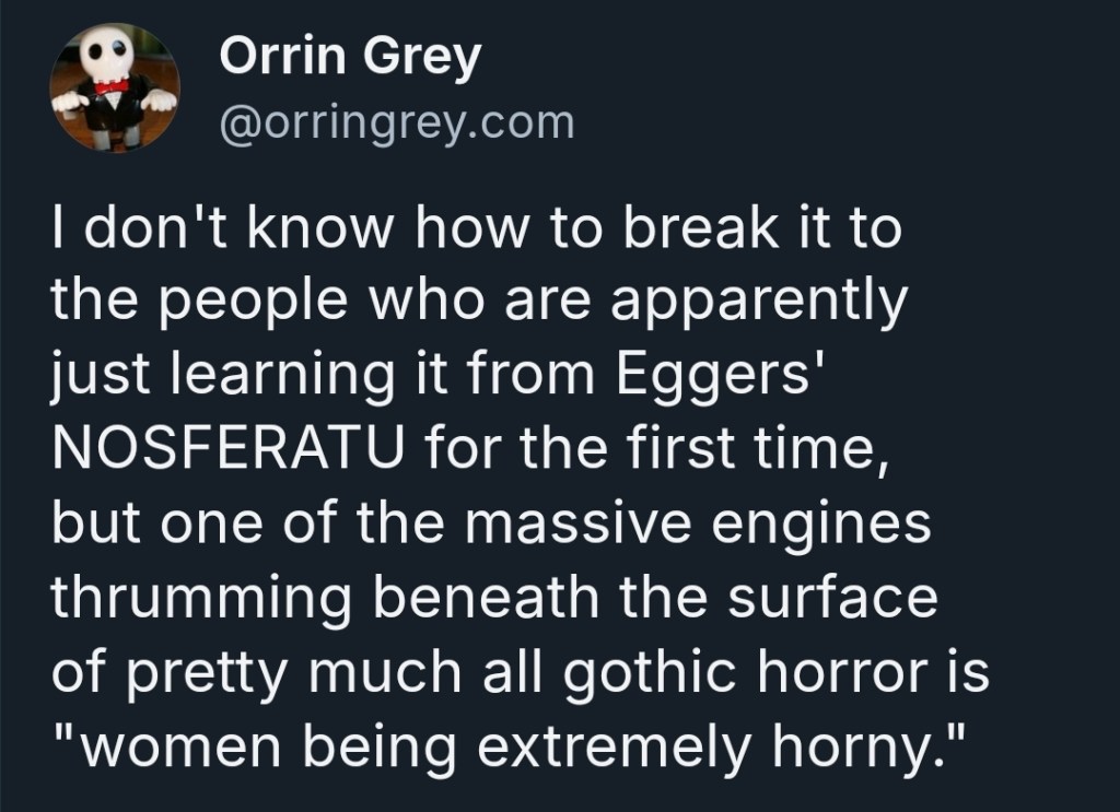 On New Year’s Eve, I made a jokey (if not inaccurate) post about the horny underpinnings of the gothic genre, partly as a jab at some of the breathless reactions I’ve seen to Robert Eggers’ Nosferatu from critics who really should know better. It became the first thing I’ve ever had go viral on Bluesky.