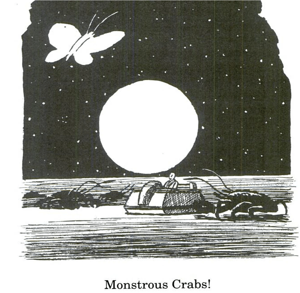 “Far away up the desolate slope I heard a harsh scream, and saw a thing like a huge white butterfly go slanting and fluttering up into the sky and, circling, disappear over some low hillocks beyond. The sound of its voice was so dismal that I shivered and seated myself more firmly upon the machine. Looking round me again, I saw that, quite near, what I had taken to be a reddish mass of rock was moving slowly towards me. Then I saw the thing was really a monstrous crab-like creature. Can you imagine a crab as large as yonder table, with its many legs moving slowly and uncertainly, its big claws swaying, its long antennae, like carters’ whips, waving and feeling, and its stalked eyes gleaming at you on either side of its metallic front?”